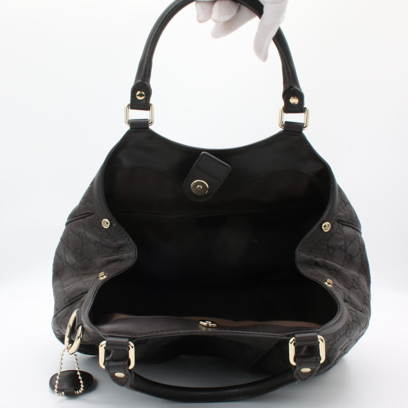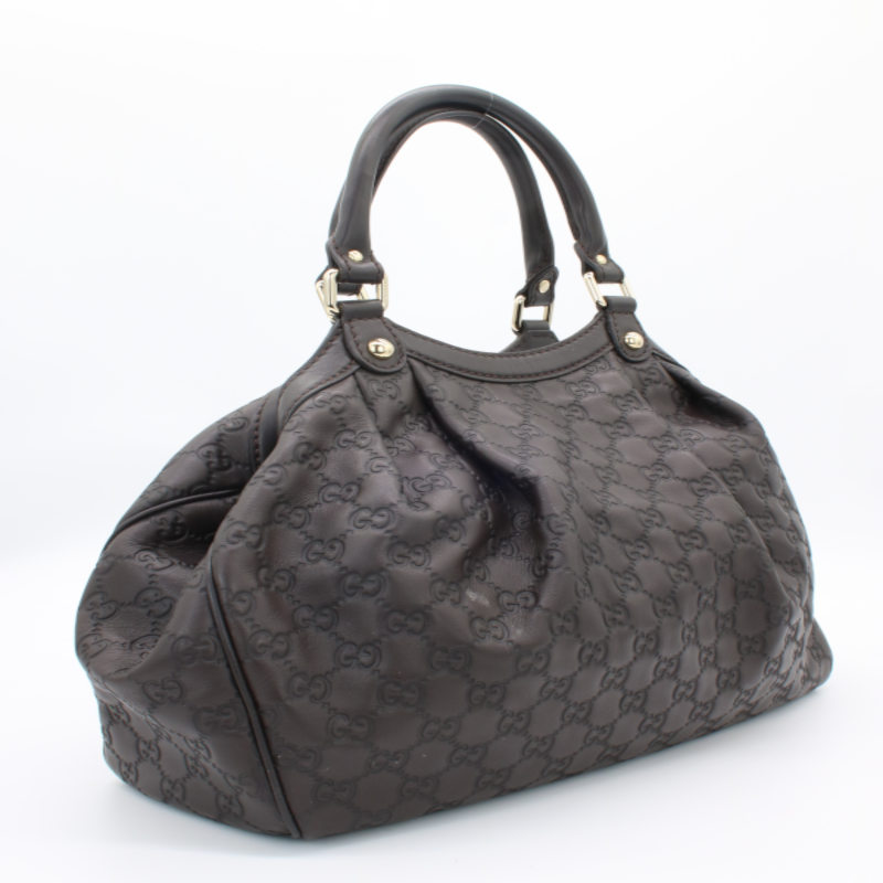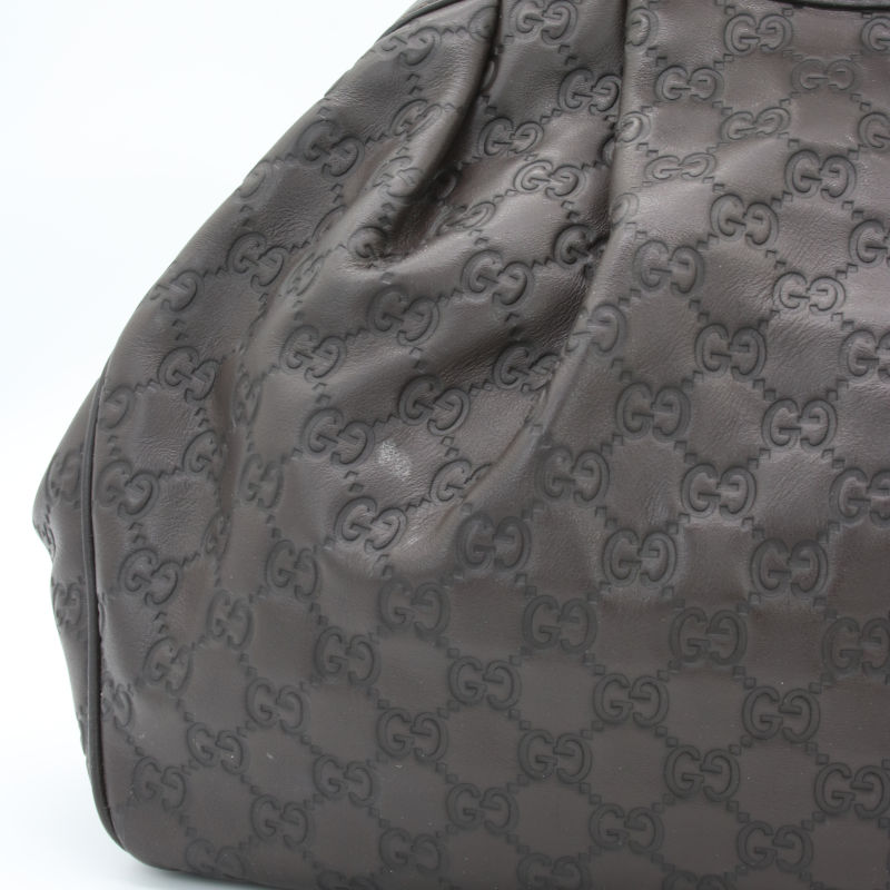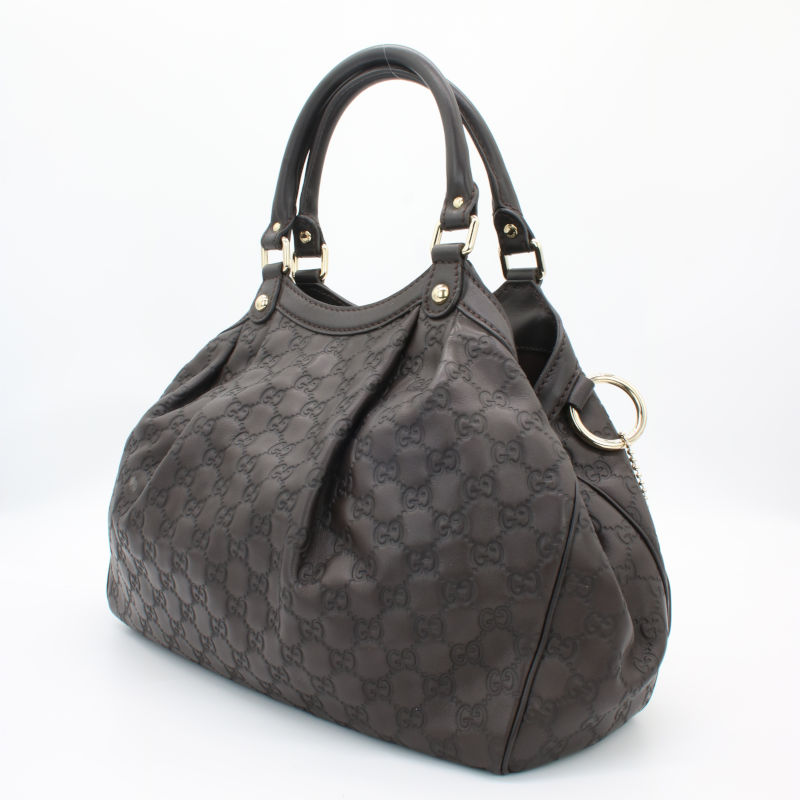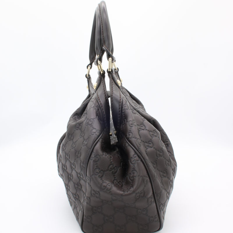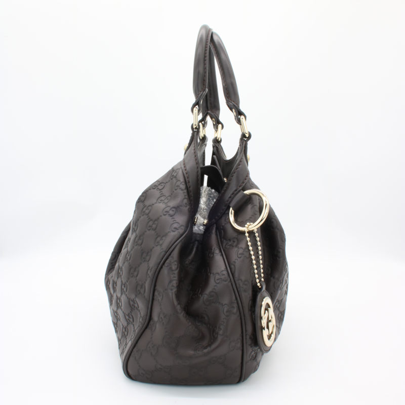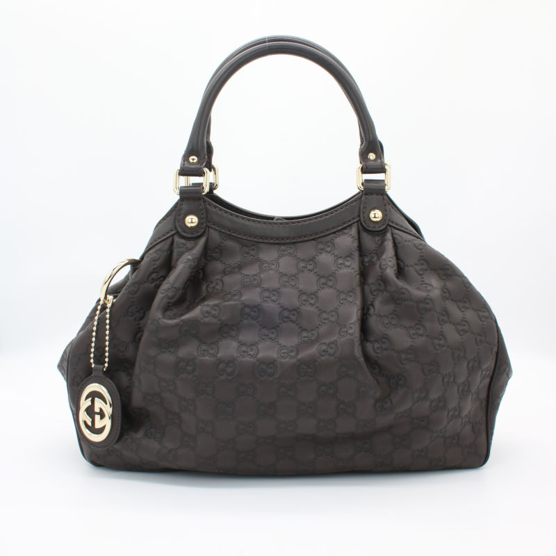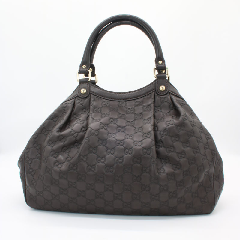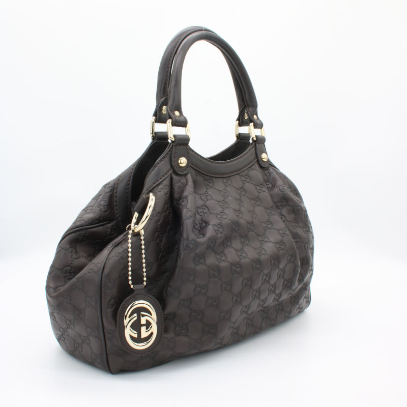 Diese elegante Gucci Sukey Hobo Bag aus hochwertigem Guccissima-Leder in zeitlosem Dunkelbraun ist ein echtes Statement-Piece für jeden Anlass. Das charakteristische allover GG-Prägemuster und die goldenen Metallbeschläge verleihen der Tasche ihren unverwechselbaren Luxus-Charakter. Die Tasche befindet sich in einem sehr guten Gebrauchszustand – alle Nähte, Griffe und Beschläge sind einwandfrei intakt. Lediglich auf der Rückseite ist ein kleiner Fleck vorhanden, der dem hochwertigen Gesamtbild kaum Abbruch tut. Eine wunderschöne Gelegenheit, einen klassischen Gucci-Look zum attraktiven Preis zu erwerben.